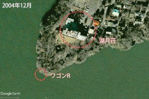 場所的にはここで、2009年以降は木が伸びていて、湖月荘跡地が立ち入り禁止なので、崖下には森の中の細い抜け道を徒歩でしかこれないですが