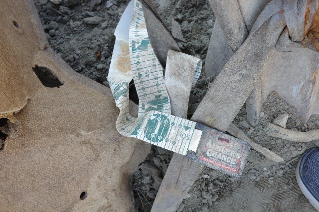 ブラックバスの大きさを測る物差しと、ルアーの残骸が落ちている。