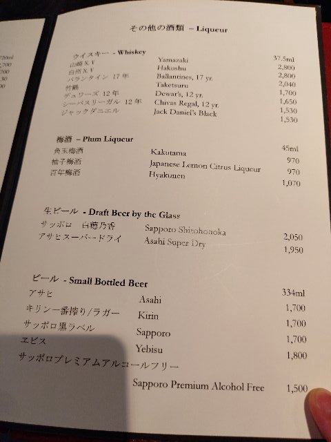 うーん、変にお茶と言っても水と言っても偉いことになりそうだ。むしろ日本酒の方が安いな。1合で1,200円と割と妥当でした。