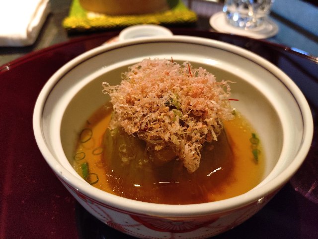 この葵コースの5番、蓋物に米茄子の鴫炊きが入っています。 ちなみに通年あるそうですが、出汁や味付けが四季で変わります。