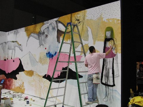 なんか凄い上手い絵の人のブースで、うさんくさい男が「ロフトでアートギャラリーなフレンチレストランを経営してるんだけど君の絵はいいね。非常にきてるね。」などと絵に描いたようなやり取りをしてて、あんなの本当にあるんだなぁと見てました。なんだろうあの喋り方、誠意の全く無い業界人喋りというのかな…。