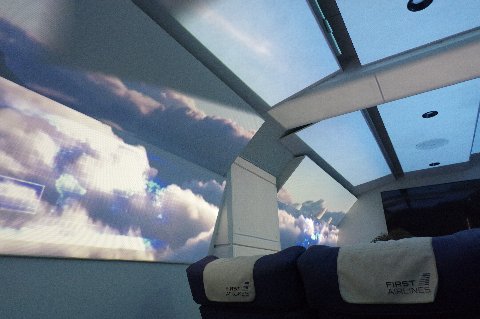おお、窓はプロジェクションマッピングの窓だ。 富士山上空です。