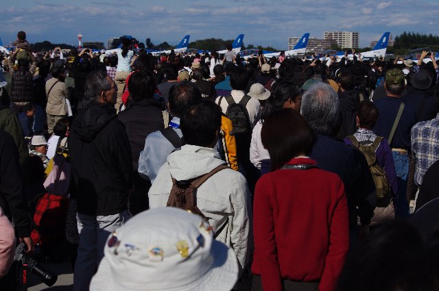 13時になると場所によっては立っているのもやっとです。私は9時から居ましたし、人気の場所からは離れてゆるい場所に陣取っていました。別にブルーインパルスの離陸を撮ろうとするのでなければどこでも一緒だからです。この時間だともう太陽も比較的建物側に行ってしまいます。午前中は太陽の位置重要です。
