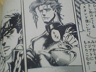 ちょっとこの花京院見て欲しいのですが、これってマトリックスのキアヌ・リーブスの原型ではないかなあ?と思うのです。あの映画、攻殻機動隊の影響とか言ってる割には、どー考えても本当はJOJOの影響の方が強いんですよね。パクリって突っ込まれないように目をそらす為に攻殻の名前出したんじゃねーの?ってくらいに。