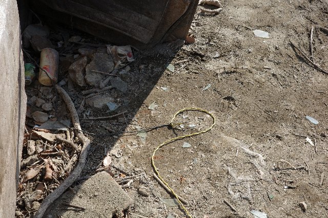 ブラックバスの大きさを測る物差しと、ルアーの残骸が落ちている。