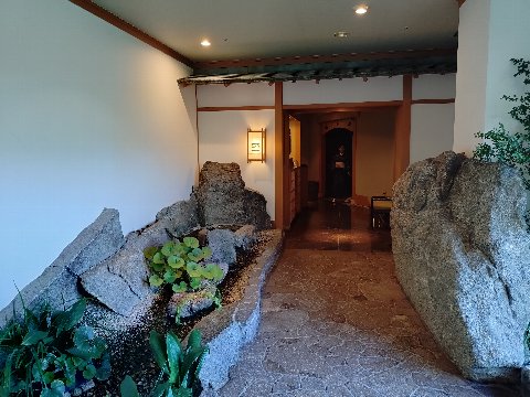 出たー! 建物の中なのに入り口の前に岩とか滝とか置きがち!