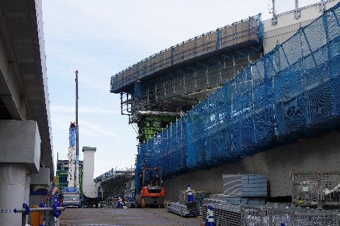 分かり易い地名で言うとりんかい線の天王洲アイル駅〜鮫洲運転試験場の辺りの運河上の高速道路の工事です。