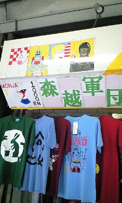 月島といえば、もんじゃ焼き、あと私的にはモヤモヤさまぁ〜ず巡礼地です。そんな訳でまず入り口にあったクリーニング店です。ナイスTシャツが多いです。なんか微妙な版権キャラのイラストがあります…。