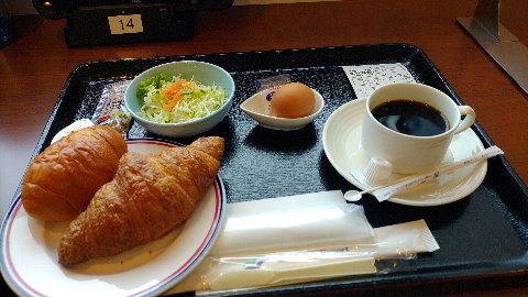 朝はバイキングではなく、和洋、カレーと粥から選べます。これはモーニングセット。 船内焼きの滅っ茶バター香るクロワッサンで、シティホテル品質。こーゆーのでいいんだよ。